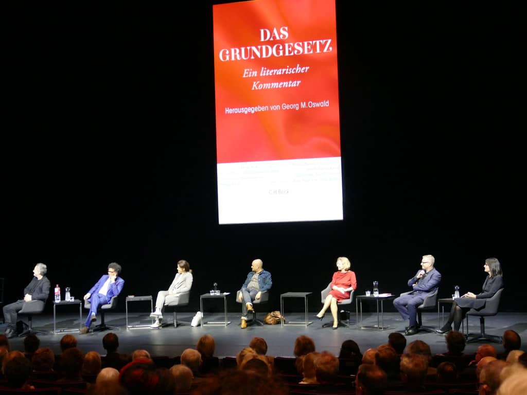 Der wirklich letzte Programmpunkt an diesem wunderbaren ersten Messetag war dann die Einladung zum großen C.H.Beck-Abend im Frankfurter Schauspiel. Meine Freude war groß, dass ich den Abend, der dem neu erschienenen, von Georg M. Oswald, herausgegebenen Das Grundgesetz Ein literarischer Kommentar gewidmet war zusammen mit Vicky (@lesestress) und Nantke (@coffeecakesandbooks) bei Sekt, Wein und Häppchen ausklingen lassen konnte. Davor war aber die Bühne hochklassig mit Autor:innen des Buchs besetzt (Julia Franck, Feridun Zaimoglu, Ijoma Mangold, Jonas Lüscher), die über die Entstehung plauderten. Interessanter Ansatz, jeden der Autor:innen einen Artikel des Grundgesetzes wählen zu lassen, um darüber zu schreiben.